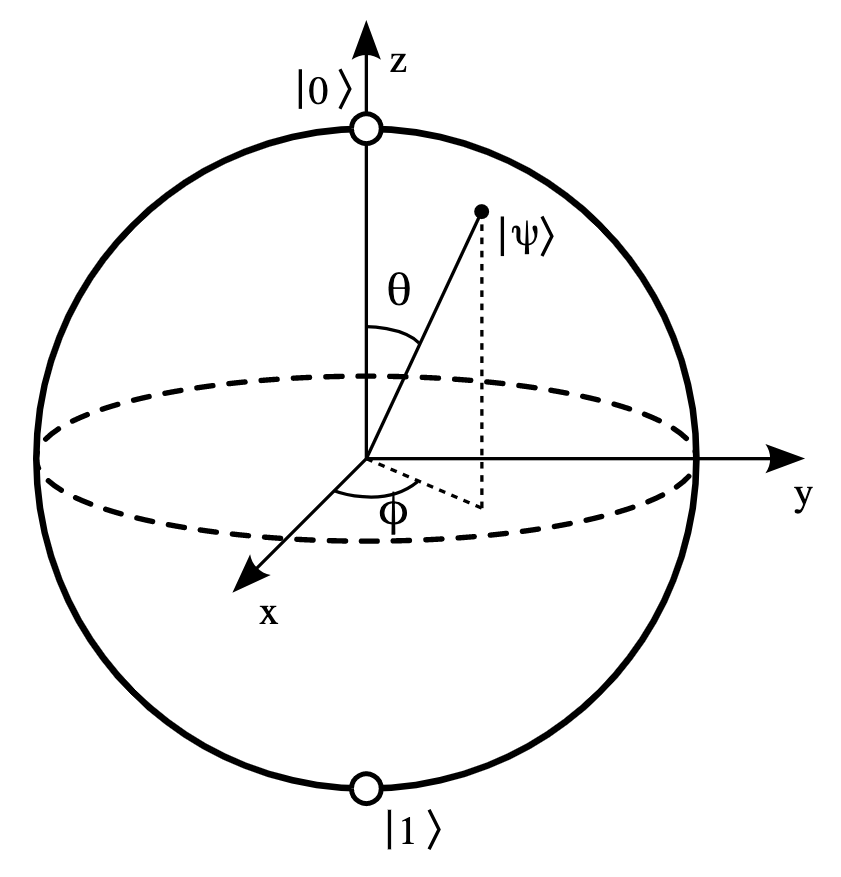 Before studying how QST is performed, let’s start by defining the basic notions. In classical computing, the most fundamental unit of computation are bits, which can be either $0$. or $1$. Analoguous notion in quantum computing is called qubits, short for “quantum bits.” However, qubits are represented by 2-dimensional unit vectors: \begin{align*} |0 \rangle = [1 ~~ 0 ]^\top, ~~~\text{and}~~~ |1 \rangle = [0 ~~ 1 ]^\top. \end{align*} One of the main difference between classical computing and quantum computing is that, unlike a classical bit which can either be 0 or 1, a single qubit state $|\Psi\rangle$ can be in the “superposition” of $|0\rangle$ and $|1\rangle$, i.e., $| \Psi \rangle = \alpha |0 \rangle + \beta |1 \rangle$, where $\alpha$ and $\beta$ are called the “probability amplitudes,” and are complex numbers. Geometrically, it can be reprensented as a point in the unit sphere, known as the “bloch sphere” in quantum computing, illustrated below:
