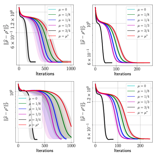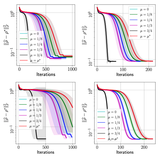 Above figure summarizes the performance of $\texttt{MiFGD}$. In the legends, $\mu^\star$ is the momentum parameter proposed by our theory; however, it should be noted that $\texttt{MiFGD}$ converges with larger momentum values than $\mu^\star$, in particular featuring a steep dive to convergence for the largest value of $\mu$ we tested. Moreover, the above figure also highlights the universality of our approach: its performance is oblivious to the quantum state reconstructed, as long as it satisfies purity or it is close to a pure state. Our method does not require any additional structure assumptions in the quantum state.