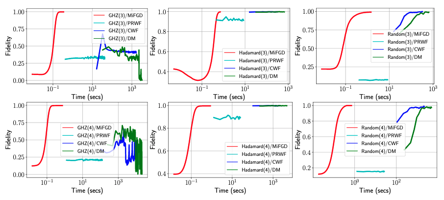 We observe that for all cases, $\texttt{Qucumber}$ methods are orders of magnitude slower than $\texttt{MiFGD}$. For the $\texttt{Hadamard}(n)$ and $\texttt{Random}(n)$, reaching reasonable fidelities is significantly slower for both $\texttt{CWF}$ and $\texttt{DM},$ while $\texttt{PRWF}$ hardly improves its performance throughout the training. For the $\texttt{GHZ}$ case, $\texttt{CWF}$ and $\texttt{DM}$ also shows non-monotonic behaviors: even after a few thousands of seconds, fidelities have not “stabilized”, while $\texttt{PRWF}$ stabilizes in very low fidelities. In comparison, $\texttt{MiFGD}$ is several orders of magnitude faster than both $\texttt{CWF}$ and $\texttt{DM}$ and fidelity smoothly increases to comparable or higher values. What is notable is the scalability of $\texttt{MiFGD}$ compared to neural network approaches for higher values of $n$.