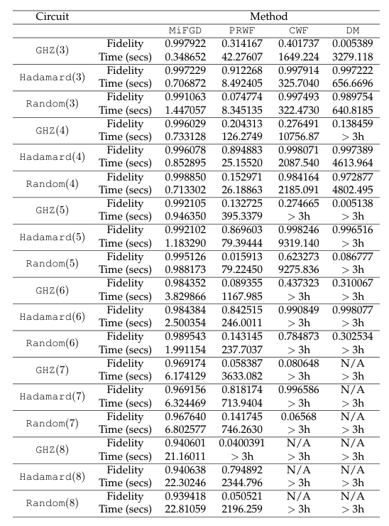 To see this more clearly, in the table below, we report the final fidelities (within the $3$ hour time window), and reported times. We see that for many cases, $\texttt{CWF}$ and $\texttt{DM}$ methods did not complete a single iterations within $3$ hours.