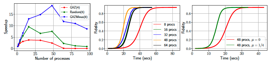 In our first round of experiments, we investigate the scalability of the parallelization approach. We vary the number $p$ of parallel processes $(p=1, 2, 4, 8, 16, 32, 48, 64, 80, 96)$, collect timings for reconstructing $\texttt{GHZ}(4)$, $\texttt{Random}(6)$ and $\texttt{GHZminus}(8)$ states, and report speedups $T_p/T_1$ we gain from $\texttt{MiFGD}$ in the figure bloew (left panel). We observe that the benefits of parallelization are pronounced for bigger problems (here: $n=8$ qubits) and maximum scalability results when we use all physical cores ($48$ in our platform).