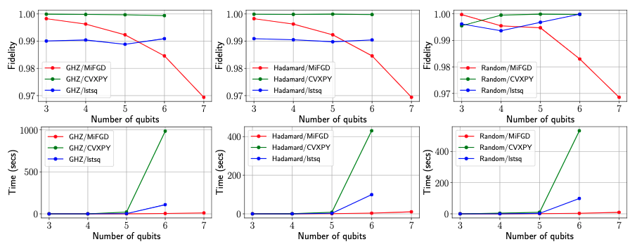 Now, we compare the performance of $\texttt{MiFGD}$ with QST methods from $\texttt{Qiskit}$, again using IBM’s QASM simulator. $\texttt{Qiskit}$ provides two QST methods: $i)$ the $\texttt{CVXPY}$ method which relies on convex optimiztion, and $ii)$ the $\texttt{lstsq}$ which ruses least-squares fitting. Both methods solve the following full tomography problem (not compressed sensing QST problem):