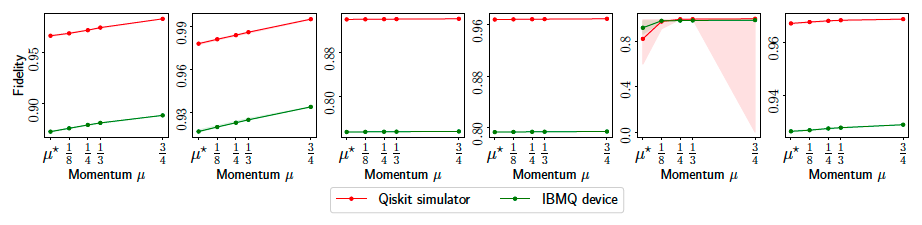 It should be noted that quantum data are inherently noisy. To highlight the level of noise existing in real quantum data, in the figure below, we also plot the performance of $\texttt{MiFGD}$ in the same setting using simulated quantum data from IBM’s QASM simulator: