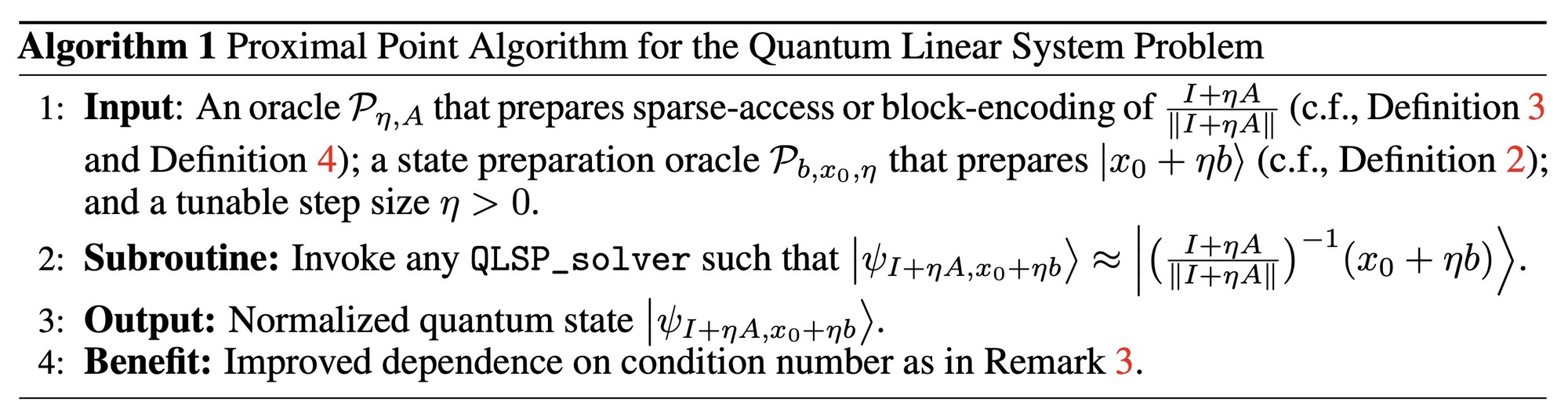 Our proposed algorithm employs the proximal point algorithm (PPA) to solve the QLSP. The core idea is to invert the (normalized) modified matrix $I + \eta A$ instead of the original matrix $A$, thus improving the system’s conditioning. The algorithm proceeds as follows: