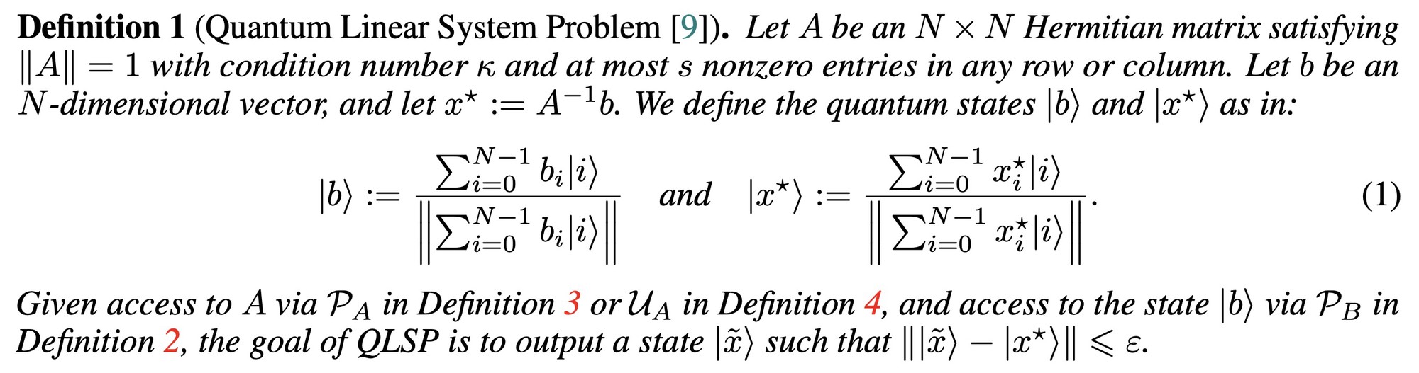 The condition number $\kappa$ is defined as the ratio of the largest to the smallest singular value of $A$. High-condition numbers indicate ill-conditioned systems that are susceptible to numerical errors, which can significantly slow down convergence and affect the final accuracy. Addressing this limitation is crucial for extending the applicability of quantum algorithms to real-world problems, which often involve ill-conditioned matrices.