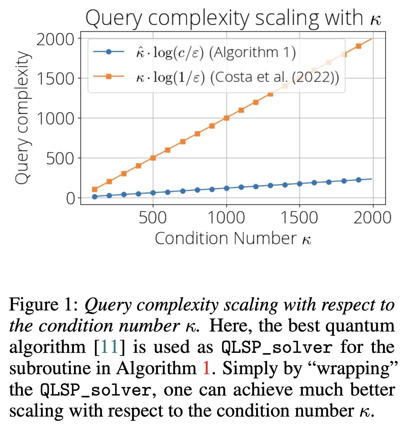 In Figure 1, we show how the query complexity scales as a function of the condition number $\kappa$. The orangle line is the state-of-the-art QLSP solver based on the discrete adiabatic theorem. Simply by “wrapping” the original QLSP solver with our proposed method, the query complexity to achieve a fixed accuracy improves as $\kappa$ increases.